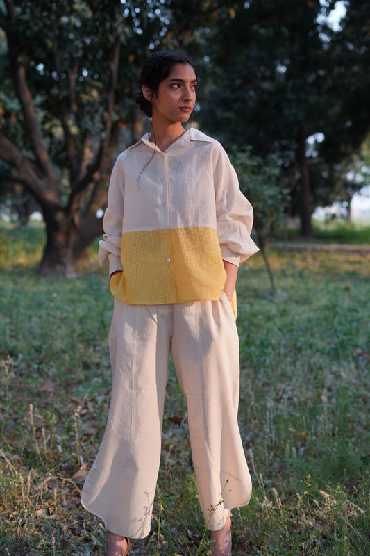 Sunlit Grid Handwoven Oversized Shirt - Yellow & kora