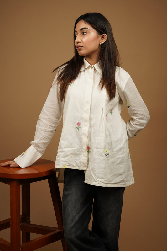 Off-White Cocoon Jamdani V Neck Flared Tunic Top
