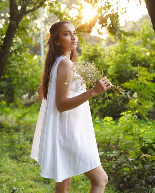 White Breeze Handwoven Cotton Round Neck Dress - Hand Embroidered