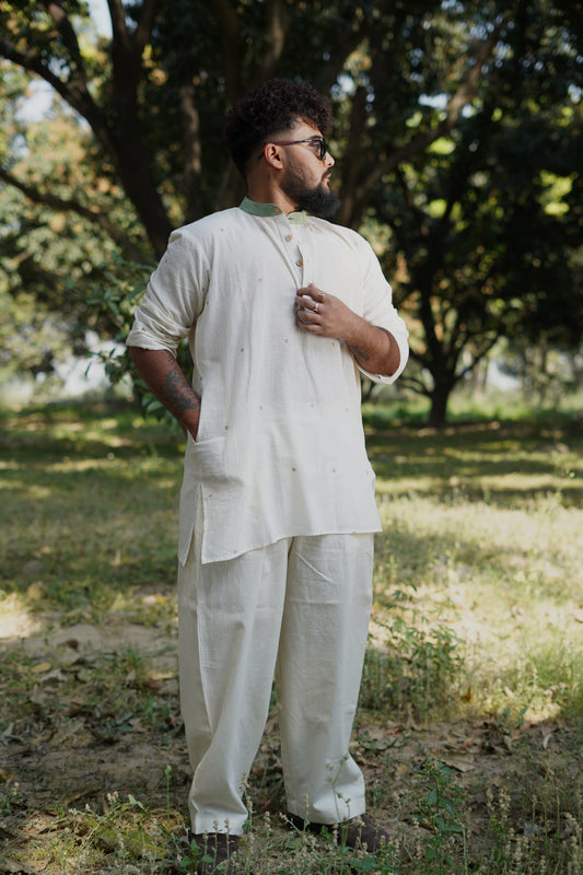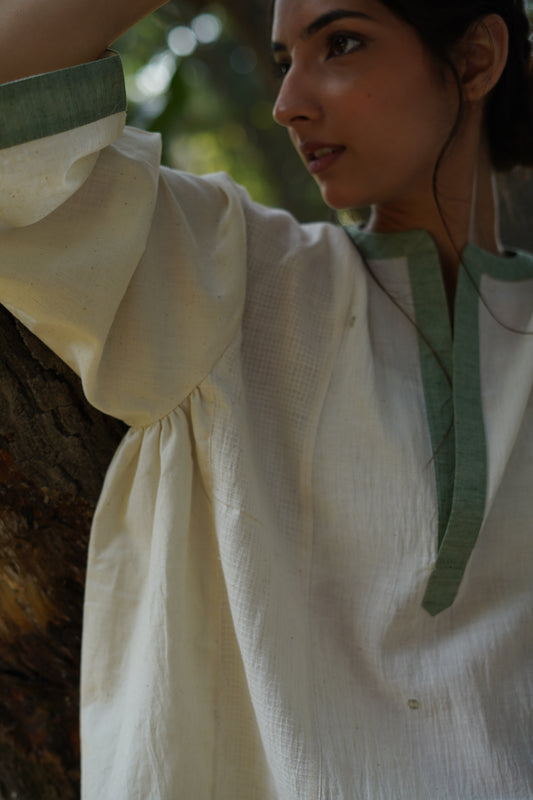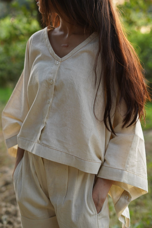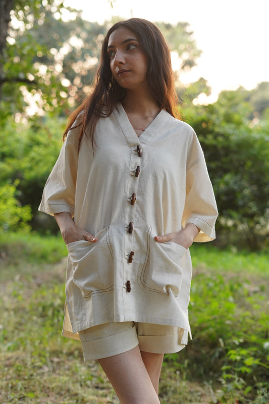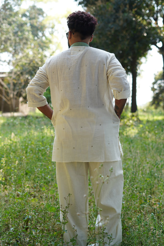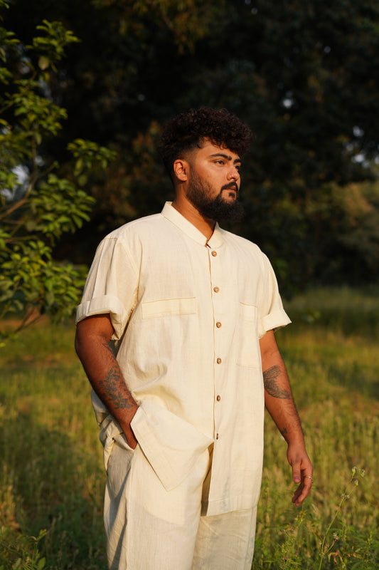 Off White Natural Khadi Chinese Collar Shirt - Handspun & Handwoven