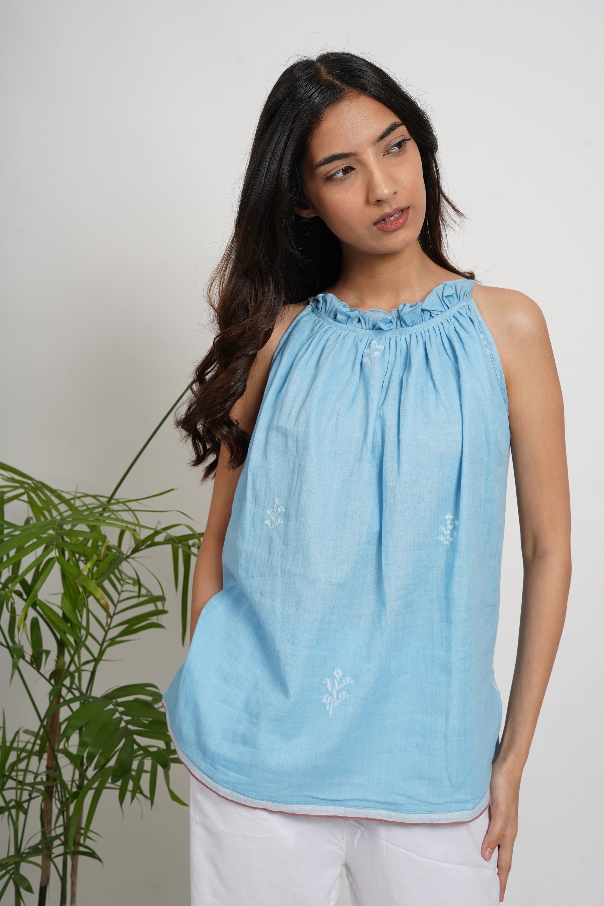 Meet the Sky High Neck Sleeveless top, a perfect blend of tradition and modern style. Made with a 32-count cotton, this top is designed mindfully with no wastage. Inspired by the skylines of Northeast India, this handwoven buti fabric took a month to craft on an old-school loom by Paridhaan Weavers.