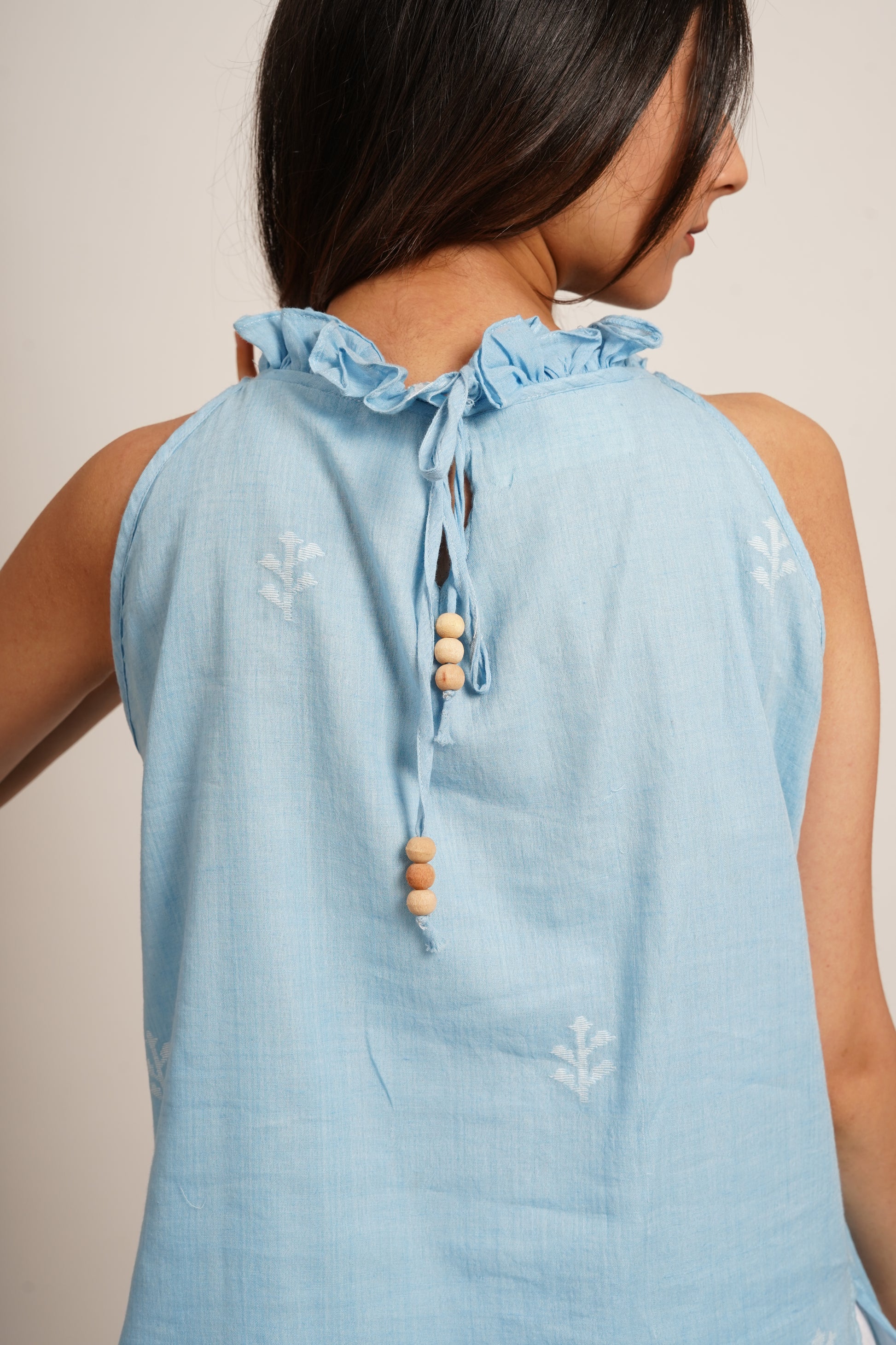 The fabric's selvage is used at the bottom to add that unique detail only handloom can bring. While the high neck ruffles, and adjustable dori at the back with wooden beads create earthy vibe. Lined with pure mulmul cotton for all-day comfort, this timeless piece celebrates slow fashion.
